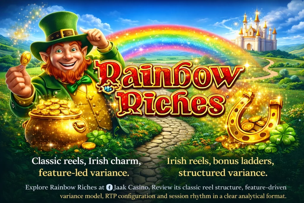 For players accessing Rainbow Riches through Jaak Casino, the structural identity remains consistent: a classic reel format with segmented feature concentration rather than streak amplification.